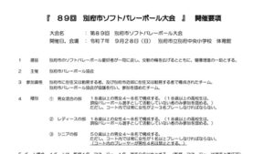令和7年9月28日(日)に、別府市立別府中央小学校で開催されます、「第89回別府市ソフトバレーボール大会」の大会要項を公開しましたので、お知らせいたします。 下記のリンクよりご覧ください。